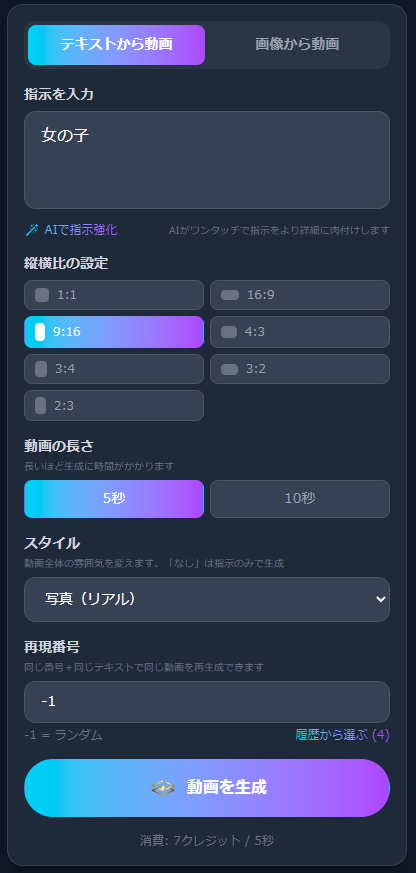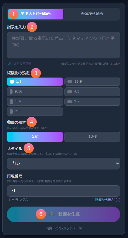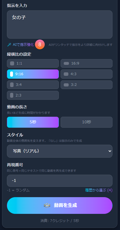 5秒または10秒を選べます。長いほど生成に時間がかかります。