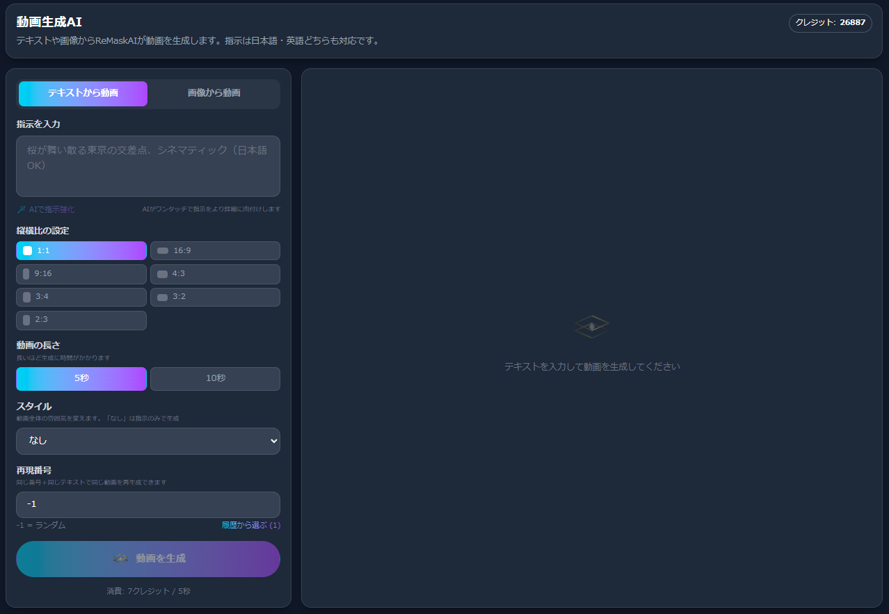 入力したテキストをRe:MaskAIが自動で詳細な指示に変換してくれる機能です。「女の子」のような短いテキストでも、構図・照明・雰囲気・動きなど、指示していない部分を自動で追加して、プロ品質の指示文に仕上げてくれます。
