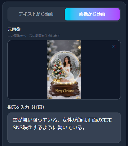 例えば、今回はRe:Mask画像生成AIで作ったこちらのおしゃれなスノードームの写真をアップロードして、動きの指示を入力します。