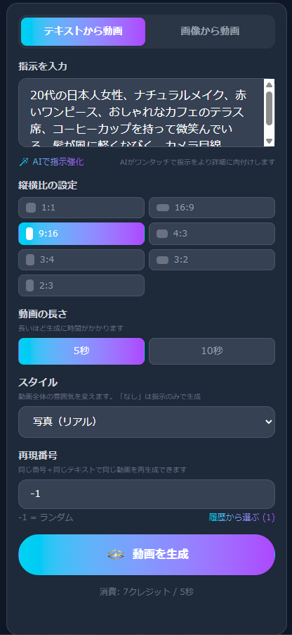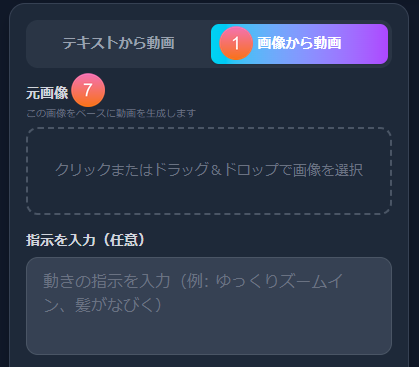 テキストだけで生成する「テキストから動画」モードと、画像をベースにする「画像から動画」モードを切り替えます。